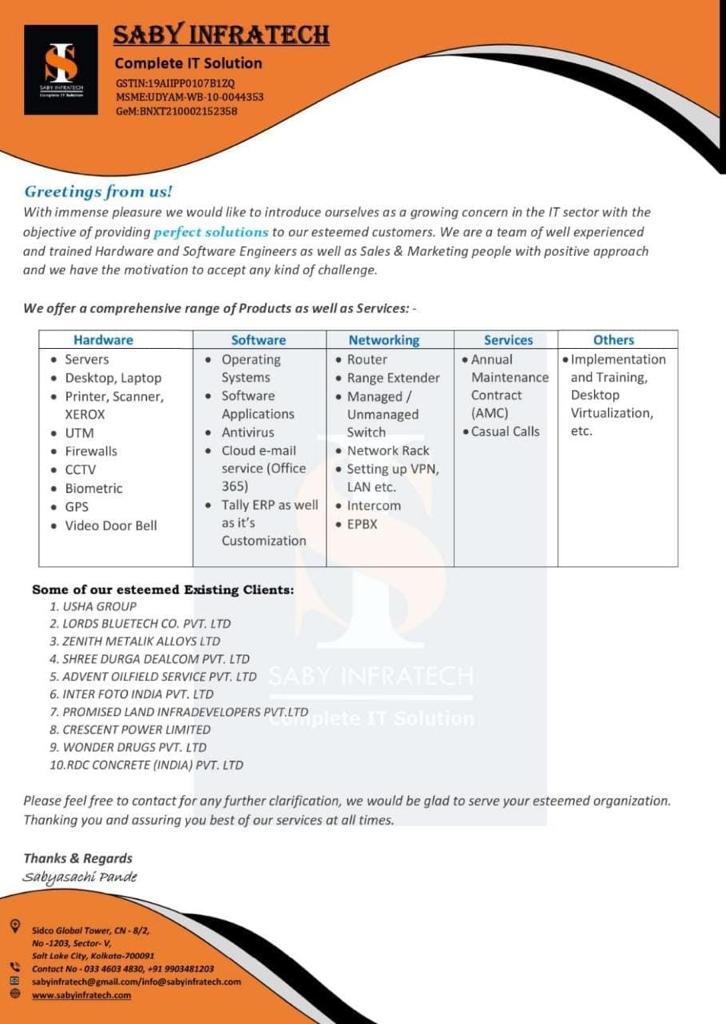 We have a successful track records of years in serving our clients with innovative and specialized IT solutions.We at Saby Infratech provides cutting edge solutions for all IT and office Automation needs of our esteemed clients to stay ahead of their competitors.